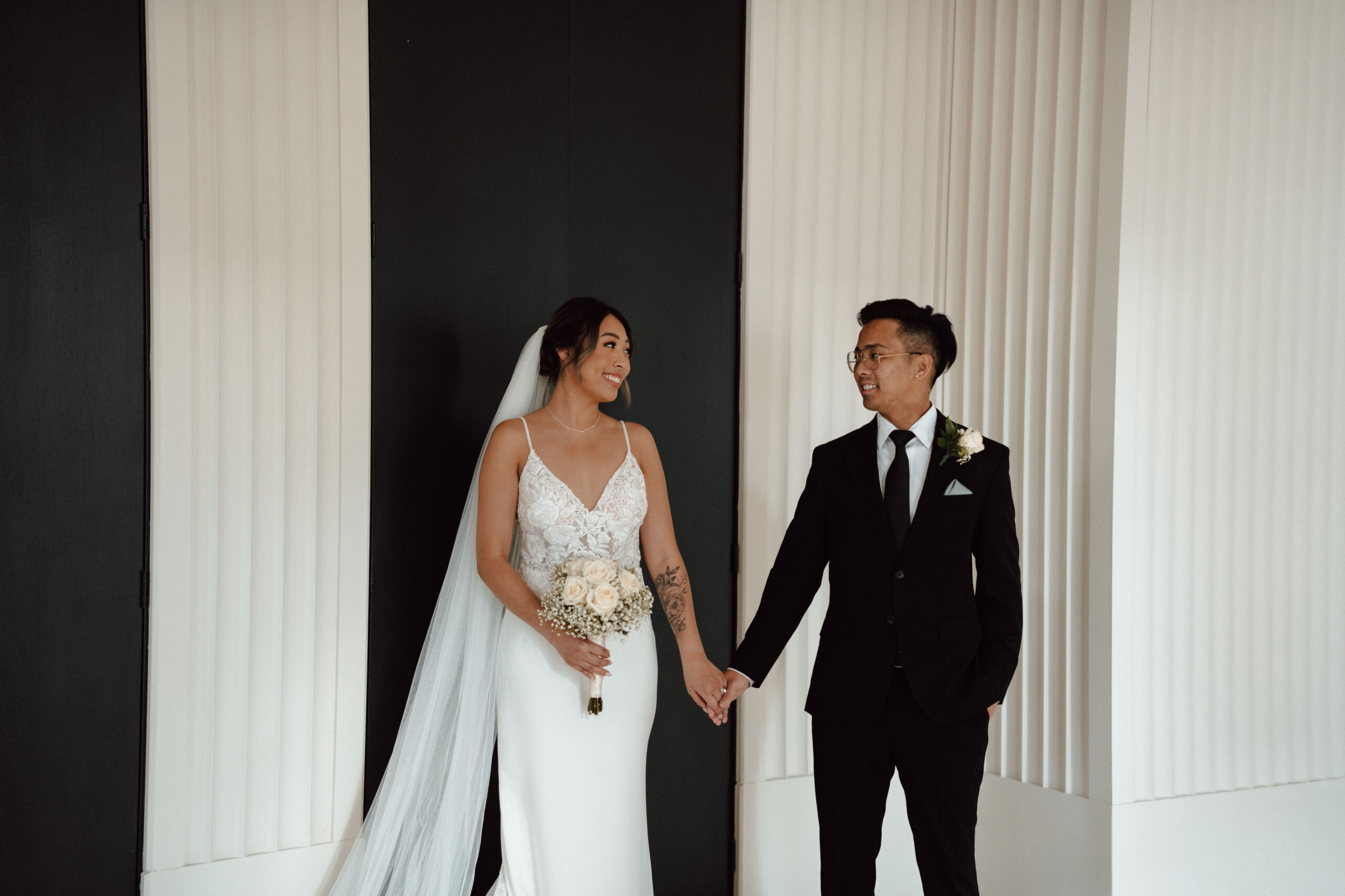 Following the Tea Ceremony, the couple celebrated their romantic wedding ceremony at District 28, an iconic venue located in the heart of the city. Known for its sleek white walls and industrial charm, the venue offered a blank canvas that perfectly complemented the couple’s timeless vision. A live guitarist played romantic tunes throughout the ceremony, adding an intimate touch to the atmosphere.